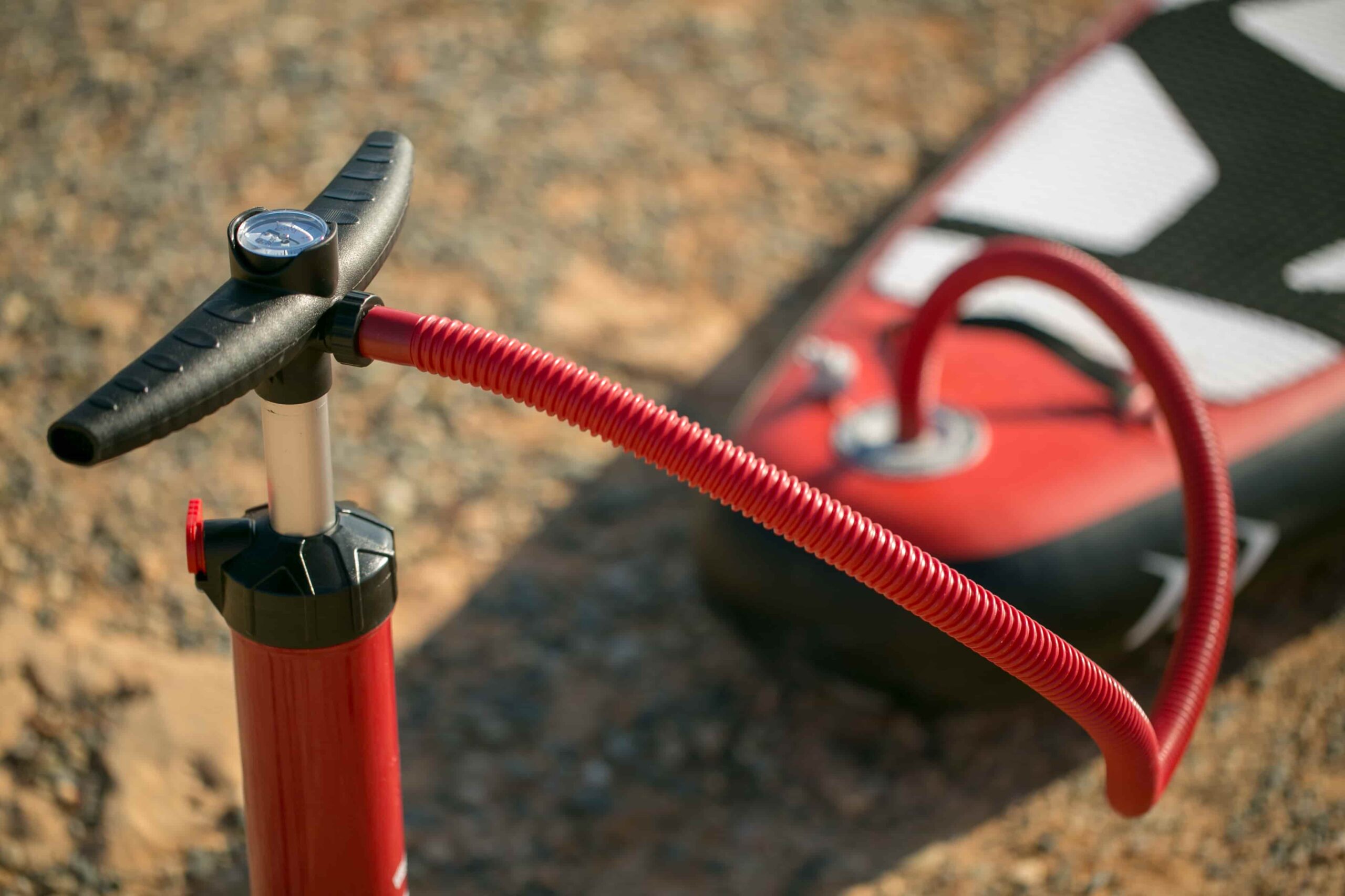 Pompa su slėgio matuokliu pripučiamoms irklentėms. Dvigubo veikimo pompa turi jungiklį, skirtą pūtimo intensyvumo režimams (dvigubo veikimo / viengubo veikimo). Dvigubo veikimo režimu rekomenduojama pūsti irklentę iki maždaug 8 psi slėgio, tada reikia perjungti jungiklį į vieno veikimo padėtį ir pūsti iki darbinio slėgio.